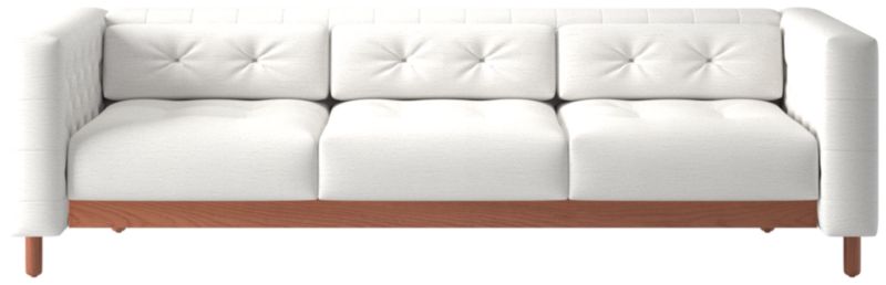 This sleek, low sofa was originally created by iconic Italian designer Gianfranco Frattini for the fashionable Restaurant St. Andrews in the heart of old Milan. Now, a modern classic returns with the same spirit of the original design, with room for three. Period-authentic details include hand-sewn button tufts on the interior sides and cushions, along with the inset walnut legs that are characteristic of the designer's signature style. CB2 exclusive.
