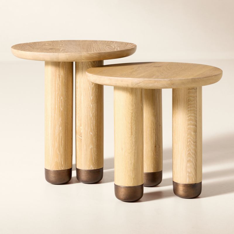 Warm oak nesting side tables by Mary Ratcliffe are imbued with a love for the yin and the yang—the feminine and the masculine, the organic and the industrial. Wirebrushed to highlight the wood's natural grain, the curved top is supported by solid oak legs certified sustainable by the Forest Stewardship Council ® (FSC). Cast metal feet feature an antiqued finish for rich tone and texture. CB2 exclusive.
