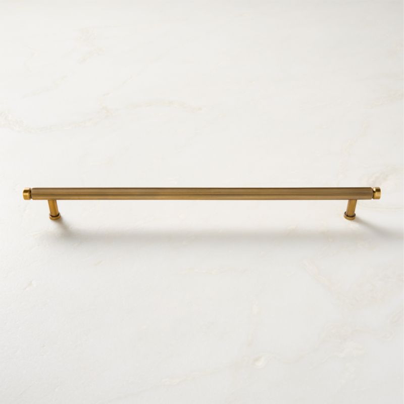 Elevated brass cabinet handle by fashion-turned-home-designer Brett Beldock features a fine ribbed detail that can pull a room together. CB2 exclusive.