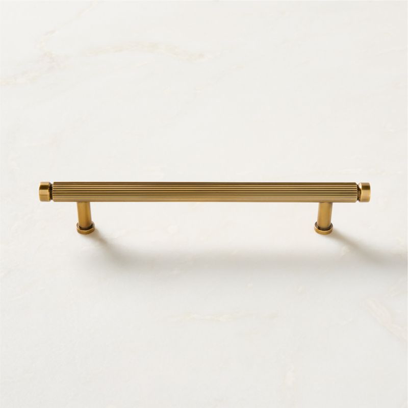 Elevated brass cabinet handle by fashion-turned-home-designer Brett Beldock features a fine ribbed detail that can pull a room together. CB2 exclusive.