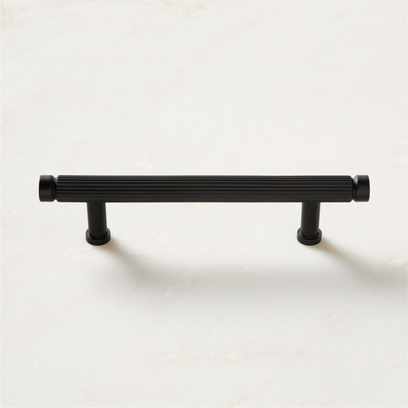 Elevated brass cabinet handle by fashion-turned-home-designer Brett Beldock features a fine ribbed detail that can pull a room together. CB2 exclusive.