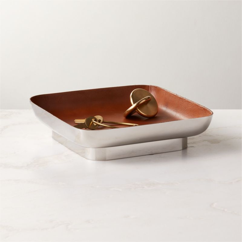 Square valet tray by NYC-based designer Nicholas Obeid is modern and elegant. Polished stainless steel is paired with rich tan leather for an organic accent on a nightstand or entryway table. CB2 exclusive.