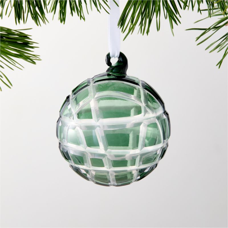 Sophisticated cut glass ball ornament by NYC-based designer Brett Beldock sparkles among Christmas tree lights. Skilled artisans shape the ornament into a ball with an intricate cut glass design for a stunning effect. CB2 exclusive.