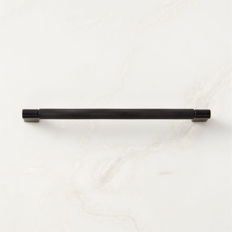 Designed by Barcelona-based Mermelada Estudio, textured brass handle brings a modern, industrial aesthetic to cabinet doors. Pair with the Nicolo knob for a cohesive look. CB2 exclusive.