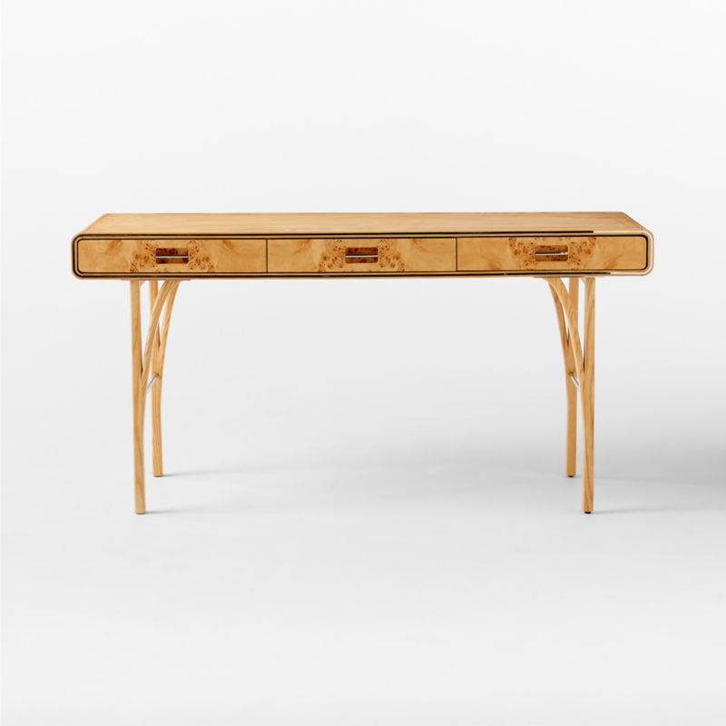 Brett Beldock is complemented by shaped wooden legs and rounded corners that lend visual interest. Four storage drawers are wrapped in mappa burl wood, highlighting the complex, swirling wood grain. Stainless steel hardware and details accent the piece, refreshing the traditional with an elegant mix of materials. CB2 exclusive.