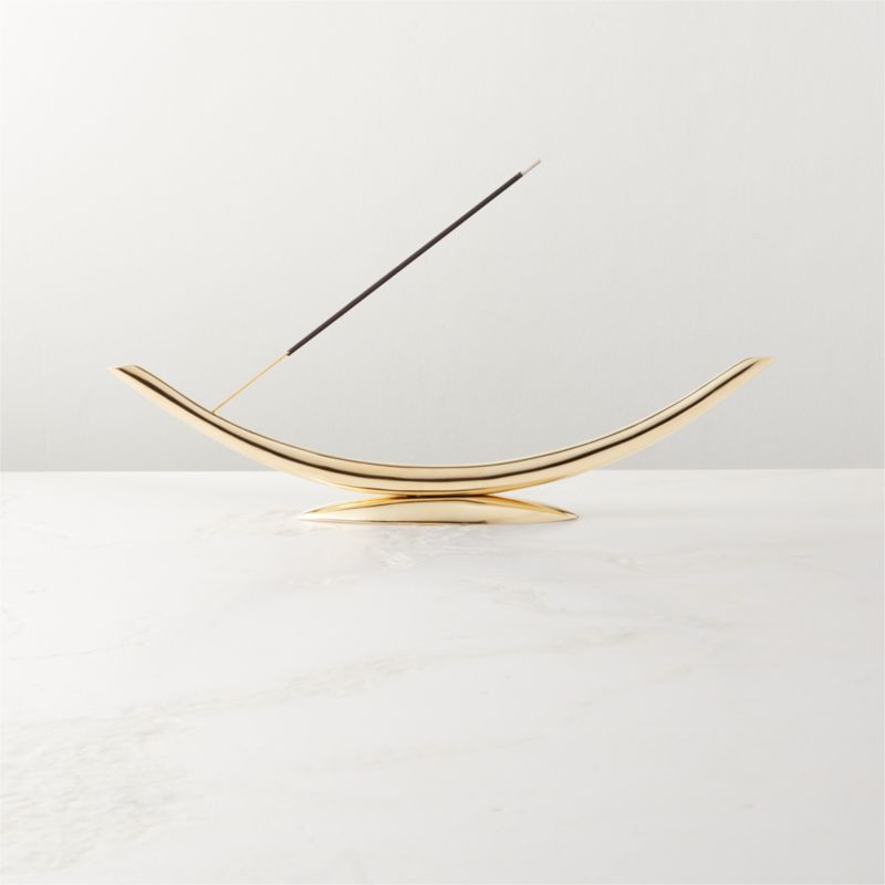 Brass incense holder by Italian designer Veronica Balutto is both decorative and functional with its subtle curves and minimalist design. Cast of unlacquered brass, the holder is designed for incense sticks, but can double as an elegant decor piece on the dining table or credenza. Brass is unlacquered, offering a living finish that will develop the patina of a vintage find. CB2 exclusive.