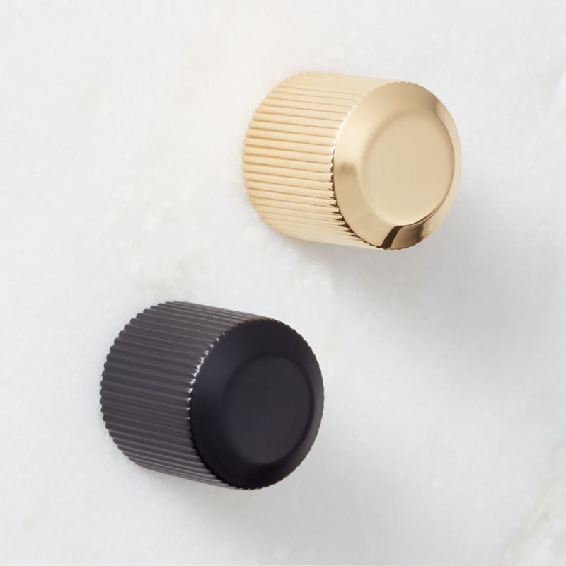 Distinguished by the play between smooth brass and an elegant ridged detailing, round knob is based on the haute hardware designs that grace professional-grade French kitchens. Designed by Italian father–daughter duo Balutto Associati, hardware offers a pleasant heft in solid brass. CB2 exclusive.
