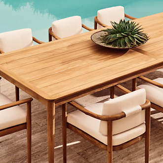 When the weather warms up there is nothing better than hosting dinner around a large outdoor dining table. Finding the right table will elevate your outdoor dining experience, especially when your tablescape can accommodate multiple guests and serving platters. From compact round tables to roomy rectangular options, the right size patio dining table is the one that serves the purpose you have for your space. For larger decks and the effervescent host, an 8 seater outdoor dining table is a smart choice. Pair your table with the right outdoor dining chairs to achieve your desired aesthetic. Outdoor wicker dining chairs with an wooden outdoor dining table cultivate an organically modern look. Meanwhile, a black metal outdoor dining table with aluminum outdoor dining chairs portrays a more urban vibe. Tie the dining set together with statement centerpieces planted in modern outdoor planter bowls and outdoor candles and lanterns to create a moody ambience throughout the night.