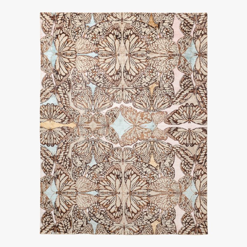 Created by London-based designer Victoria Sanders, area rug brings her hand-drawn butterfly illustrations to life as a bold, sculptural textile. Its densely knotted construction translates delicate winged forms into layered motifs, mirrored across the ivory ground in yarn-dyed shades of chocolate brown, pale grey and light teal. Hand-knotted by skilled artisans from a luxurious blend of wool and rayon, rug offers a soft, silky pile with a subtle sheen underfoot. Each rug is washed to enhance its vintage-inspired character, allowing natural tonal shifts and variations that make every piece unique. CB2 exclusive.