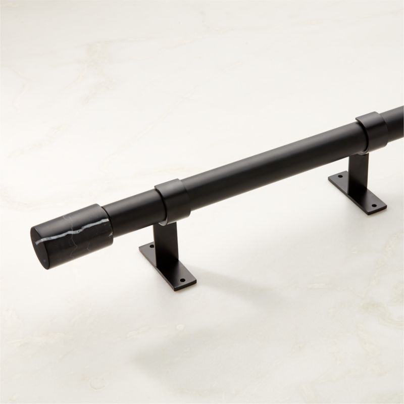 Designed by VUUE, matte black stainless steel goes the distance to display curtains. Paired with Marquina black marble finials, adjustable rod telescopes in/out for an exact fit. Proof that details really do make all the difference. CB2 exclusive.