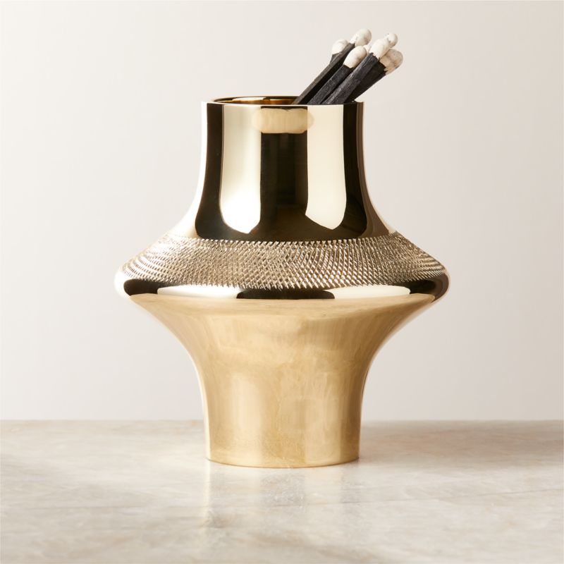 Modern brass match striker by Copenhagen-based designer Aurélien Barbry is a one-of-a-kind way to keep matches within reach. The midcentury-inspired design features a knurled detail that easily lights strike-anywhere matches. The brass is unlacquered, offering a living finish that will develop the patina of a vintage find. Simply polish the brass to restore its original luster. CB2 exclusive.