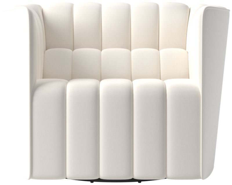 Out of production for decades, the classic Steen Østergaard swivel chair from 1980 has been reissued exclusively for CB2. The look leans modern with clean lines and a neat welt trim softened by plush channel tufting. CB2 exclusive.