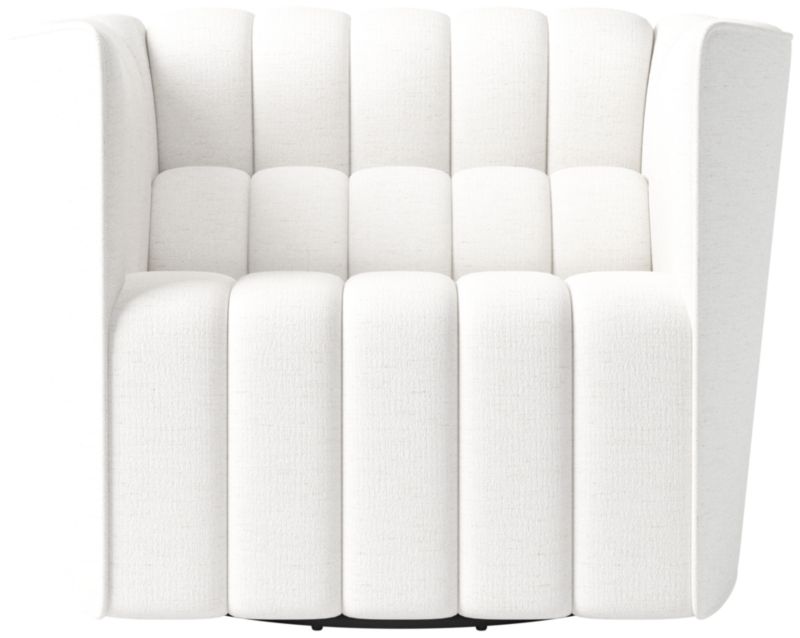 Out of production for decades, the classic Steen Østergaard swivel chair from 1980 has been reissued exclusively for CB2. The look leans modern with clean lines and a neat welt trim softened by plush channel tufting. CB2 exclusive.