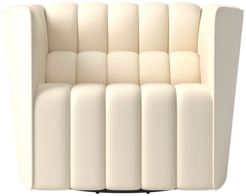Out of production for decades, the classic Steen Østergaard swivel chair from 1980 has been reissued exclusively for CB2. The look leans modern with clean lines and a neat welt trim softened by plush channel tufting. CB2 exclusive.