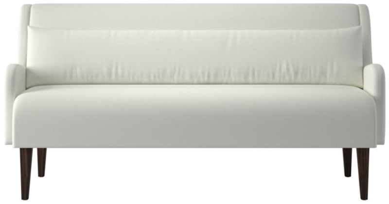 Dining bench by Sam Baron pairs sculptural form with tactile warmth. Upholstered bench features subtly rolled arms and a high, gently reclined back that invites longer meals and lingering conversation. A down-blend lumbar pillow adds relaxed support while balancing the bench's tailored profile. Conical legs, crafted from solid rubberwood certified sustainable by the Forest Stewardship Council ® (FSC) and finished in a dark brown stain, ground the silhouette with quiet sophistication. Seats up to three. CB2 exclusive.