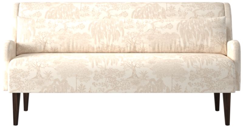 Dining bench by Sam Baron pairs sculptural form with tactile warmth. Upholstered bench features subtly rolled arms and a high, gently reclined back that invites longer meals and lingering conversation. A down-blend lumbar pillow adds relaxed support while balancing the bench's tailored profile. Conical legs, crafted from solid rubberwood certified sustainable by the Forest Stewardship Council® (FSC) and finished in a dark brown stain, ground the silhouette with quiet sophistication. Seats up to three. CB2 exclusive.