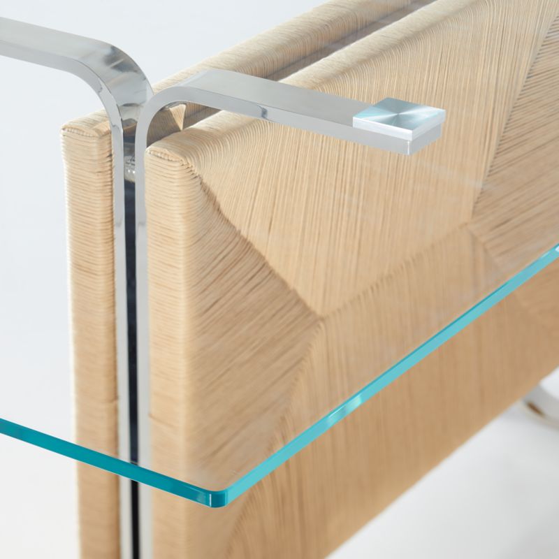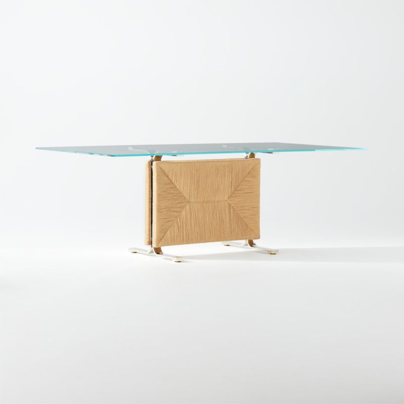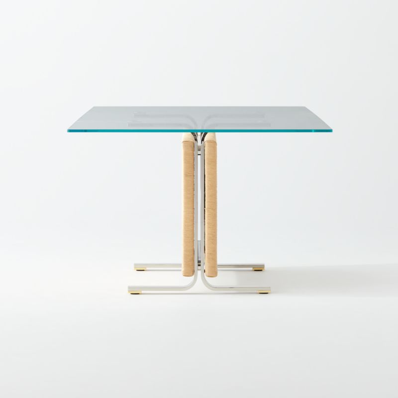 Kravitz Design dining table mixes materials to elegant effect. Ultra clear glass top with smooth radius corners sits atop a ruched base wrapped in Danish paper cord, a traditional Scandinavian material used for weaving seats and seat backs. Polished nickel feet complete the look. CB2 exclusive.