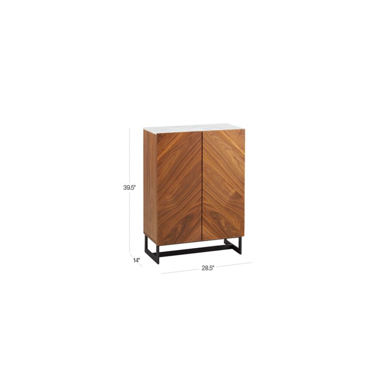 Designed by VUUE, this wood entryway cabinet spotlights the richness of natural materials. Topped with a cool slab of white Carrara-style marble with grey veining and framed by the contrasting warmth of a walnut veneer base. Precisely cut panels angle diagonally to create an abstract chevron pattern of swirling grains and tones on two soft-close doors. Opens to three shelves for storing bags/hats/scarves in the entryway, serveware in the dining room or drinkware and spirits in the living room. Learn about VUUE on our blog. CB2 exclusive.