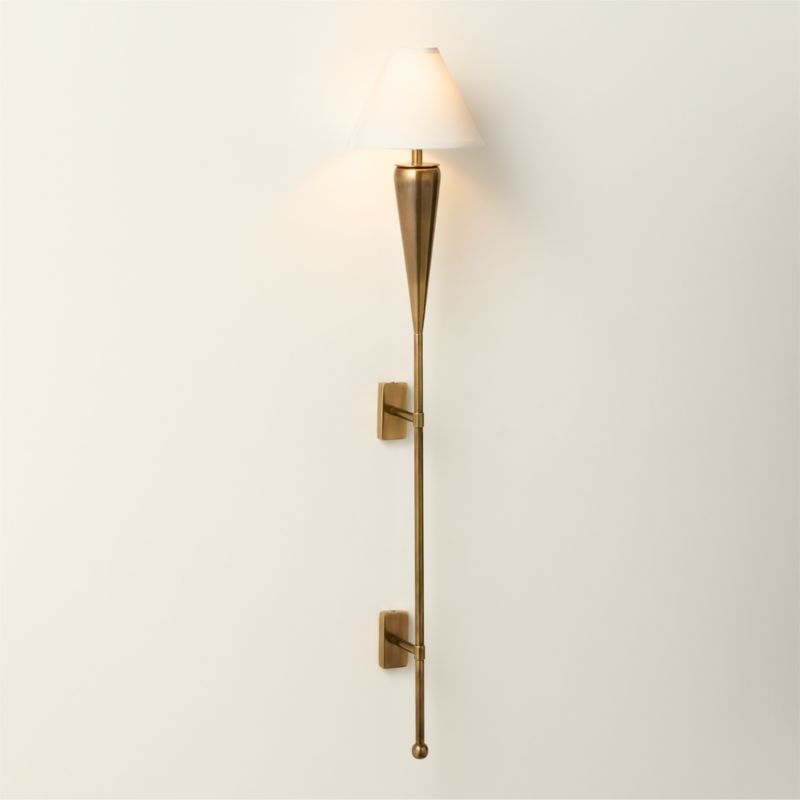 NYC-based designer David Aguirre's aged brass torch sconce is a fresh take on a traditional design with modern proportions and delicate details. The crisp white shade rests atop a slim, tapered base finished by hand to bring out the brass's rich tonal highs and lows. CB2 exclusive.