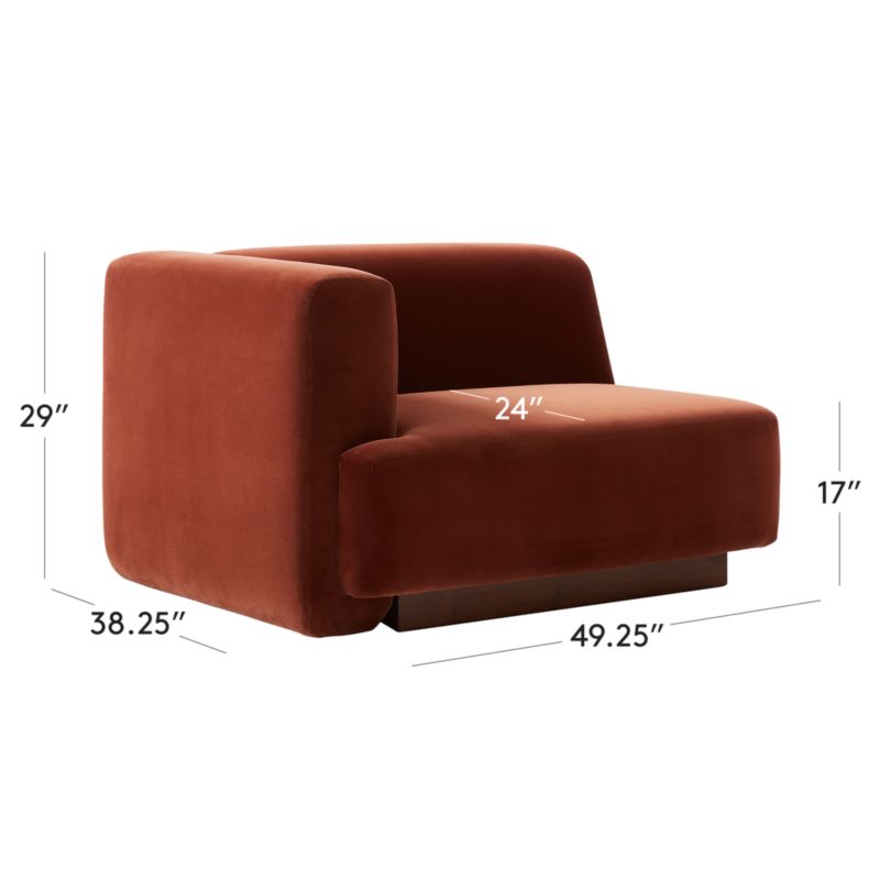 Lawson-Fenning, the Terrain furniture collection consists of modular pieces that can be arranged to create different environments. Left-arm chair has long, low lines and warm brown velvet upholstery. Walnut base, certified sustainable by the Forest Stewardship Council® (FSC), reveals warm tones and striations that vary from piece to piece. Coordinates with other sectional pieces in the Terrain furniture collection. CB2 exclusive.