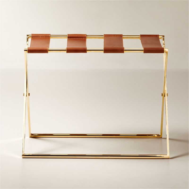 Mermelada Estudio, polished brass luggage rack offers an elevated hotel experience for the guest room. Supple top-grain leather straps and a foldable design make it easy to store. Brass is unlacquered, offering a living finish that will develop the patina of a vintage find. CB2 exclusive.