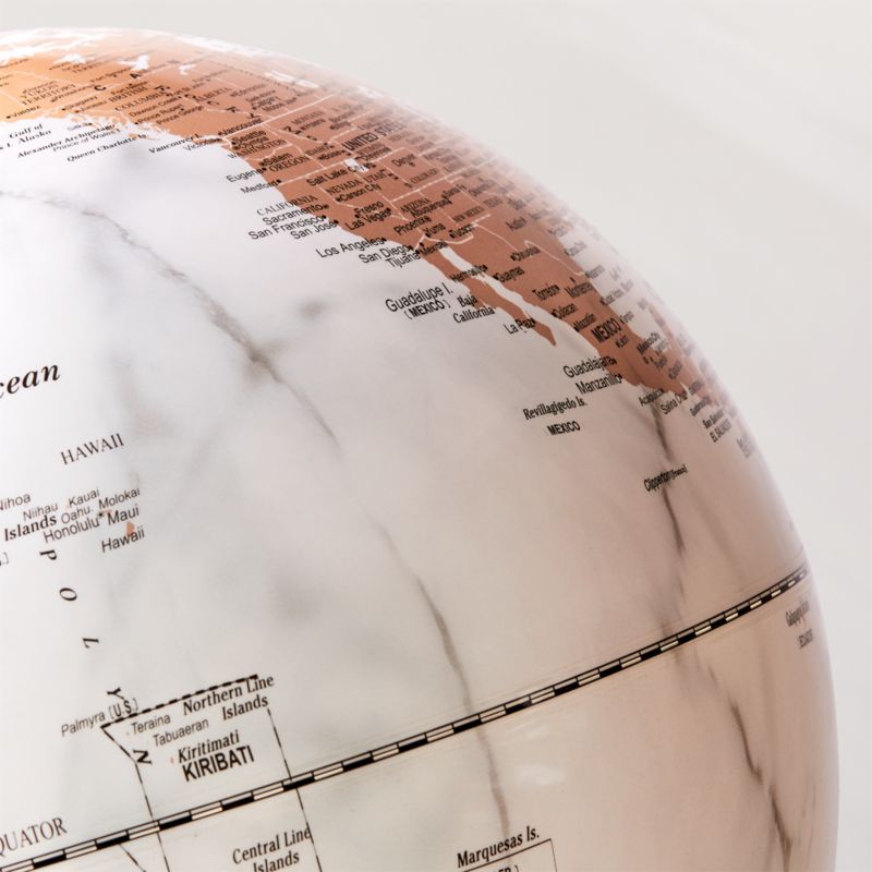 A modern spin on the traditional globe. Bronze-colored continents contrast beautifully against the white marbleized water. Solid white marble base elevates and grounds the piece. CB2 exclusive.